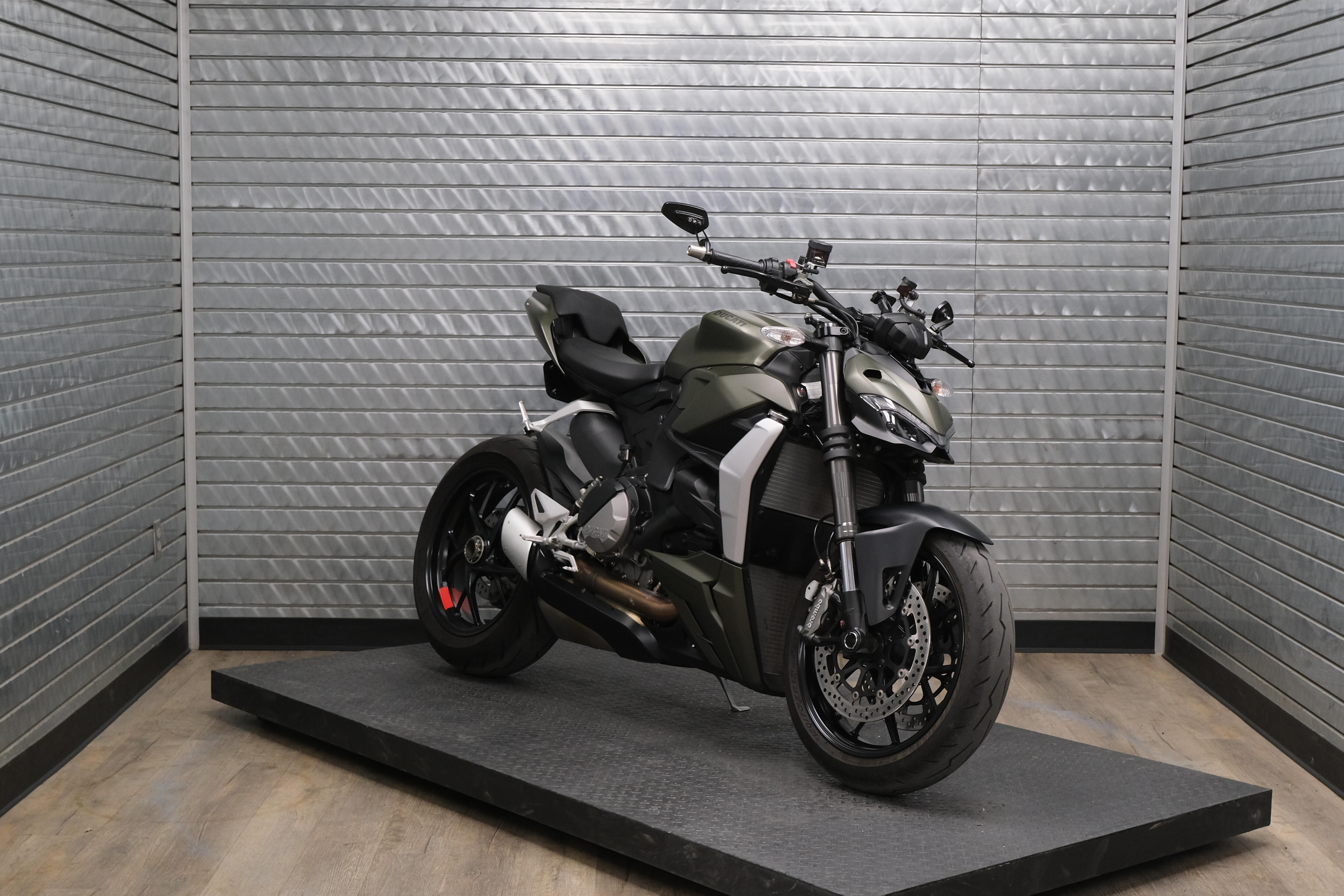 The Ducati Streetfighter V2 range includes the Ducati Red color scheme and is now expanded with the introduction of a new matte metallic green color that enhances the bike's design: Storm Green.